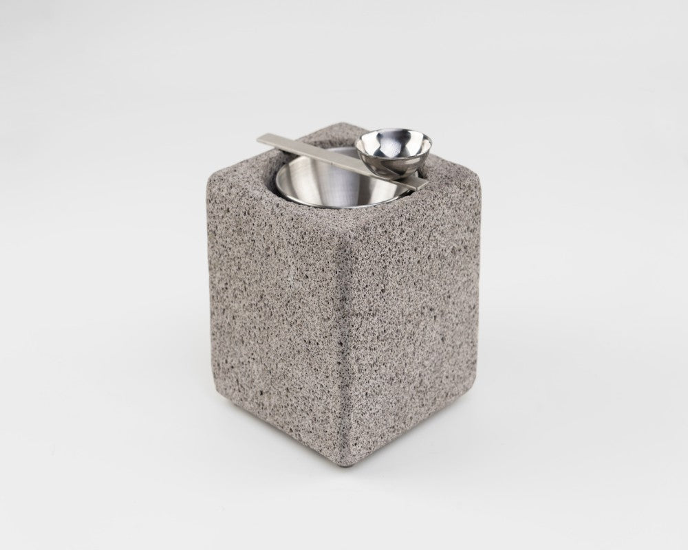 Dos piezas monolíticas de piedra volcánica, que fungen como bases para enaltecer ambos condimentos.