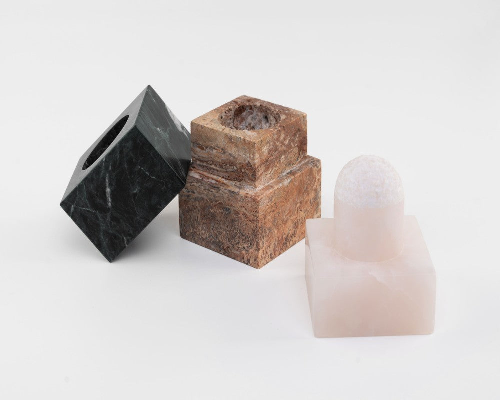 El proceso de fabricación consiste en bloques tallados a mano de tres tipos de piedras naturales: ónix rosa, mármol verde y travertino rojo. No se utilizaron resinas ni adhesivos tóxicos en la fabricación de estas piezas."