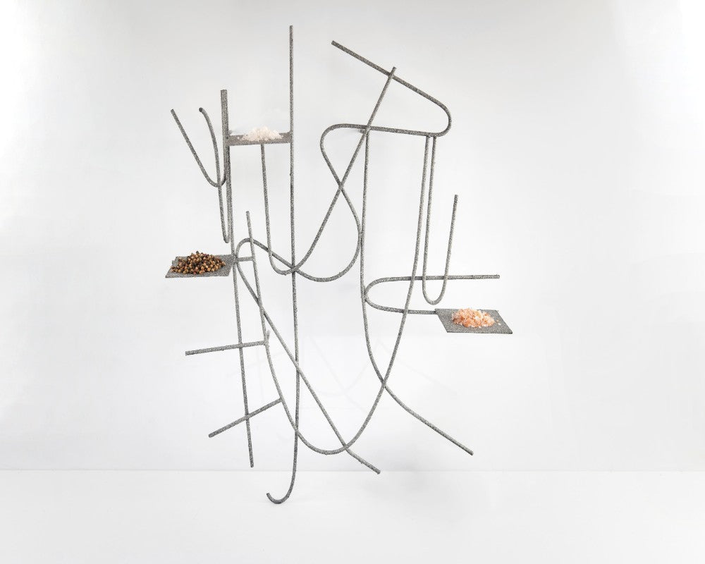 De tal suerte, la pieza formada por letras de acero que se fueron soldando, encontrando, modificando, terminan por constituir una suerte de poema abstracto que dispone grupos de sal y pimienta para que sean tomados y empleados durante el ritual culinario en turno."