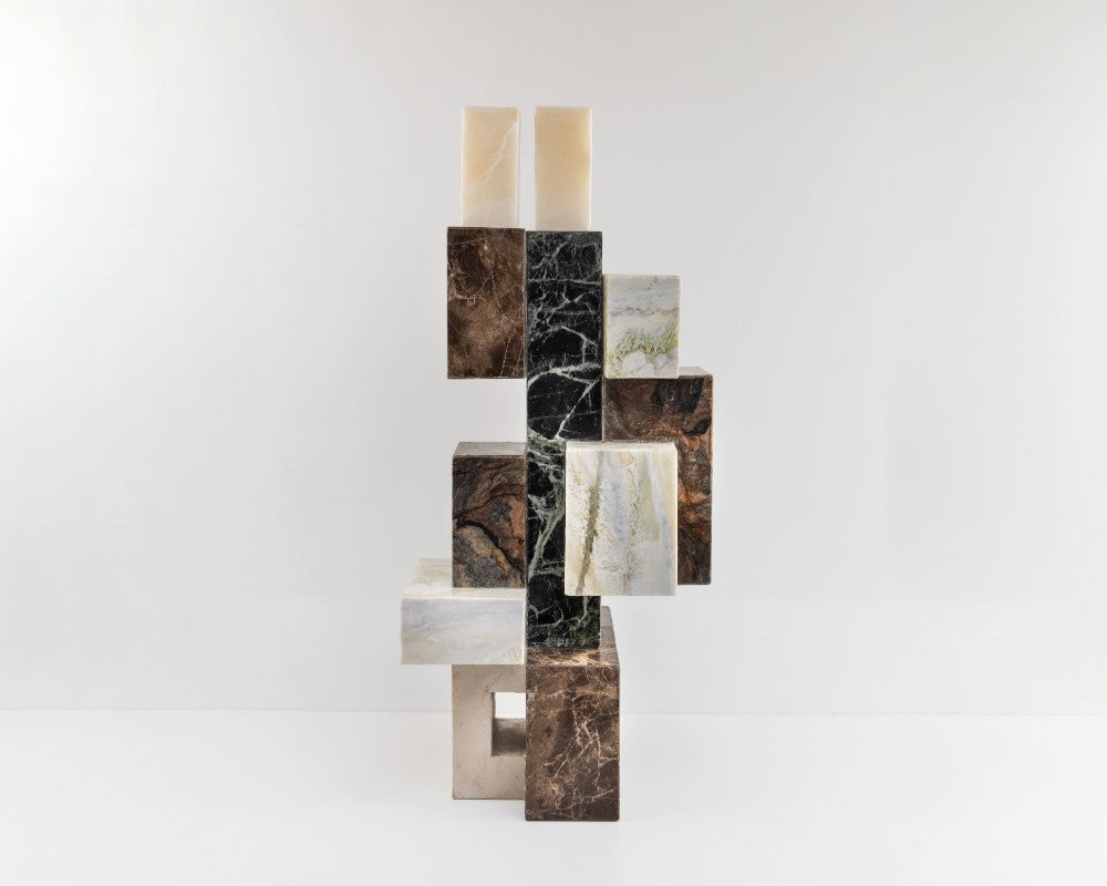 Esta pieza escultórica, concebida con un enfoque arquitectónico, se define por la pureza de sus formas cuadradas y la precisión en la articulación de sus volúmenes. Tallada en una selección curada de mármoles de diversos tonos,la composición juega con la escala, aportando una monumentalidad inesperada. Los contrastes matéricos y las aristas definidas convierten esta pieza en una micro-arquitectura que trasciende su propósito utilitario para convertirse en un objeto icónico dentro del paisaje doméstico.
